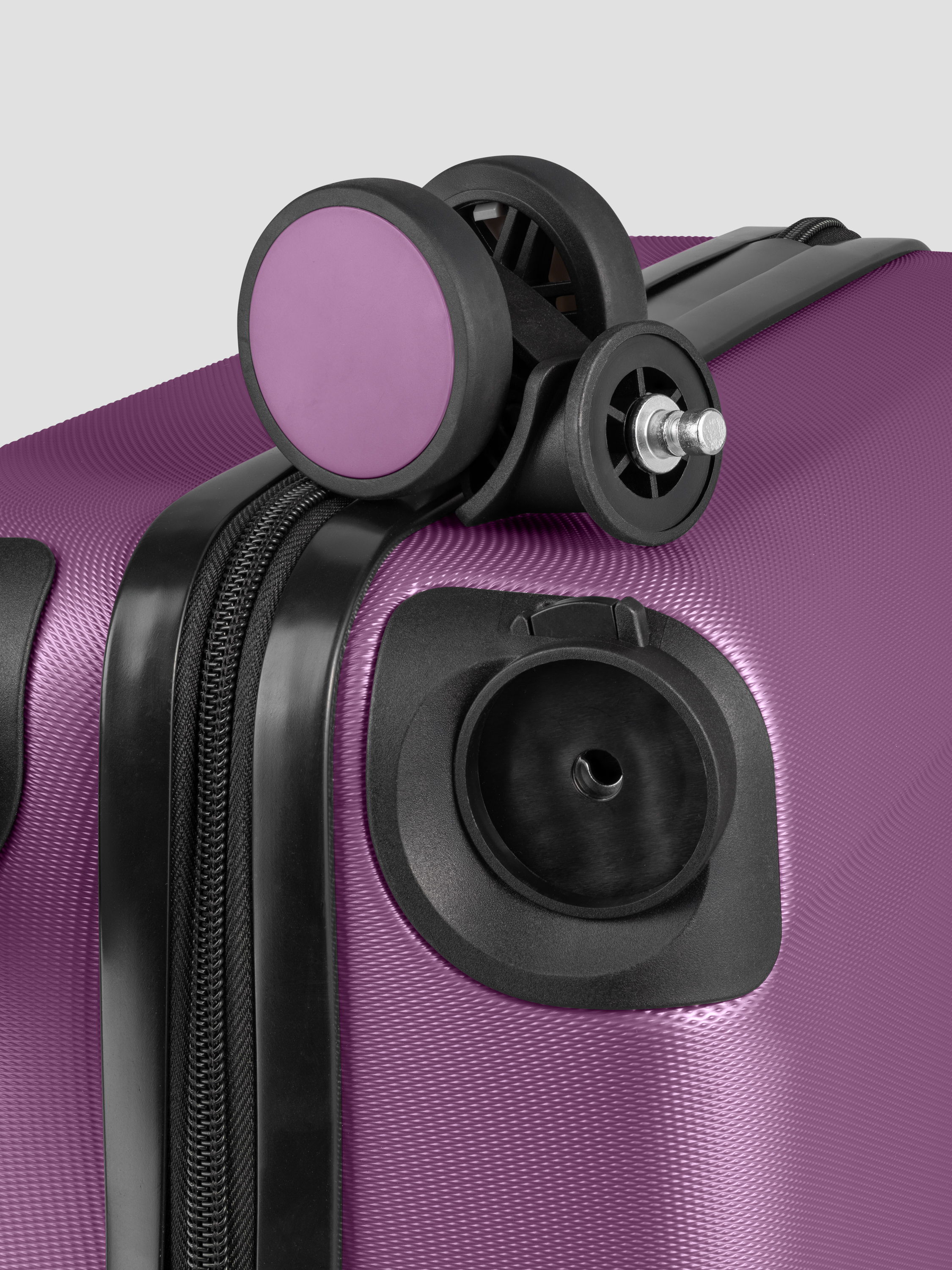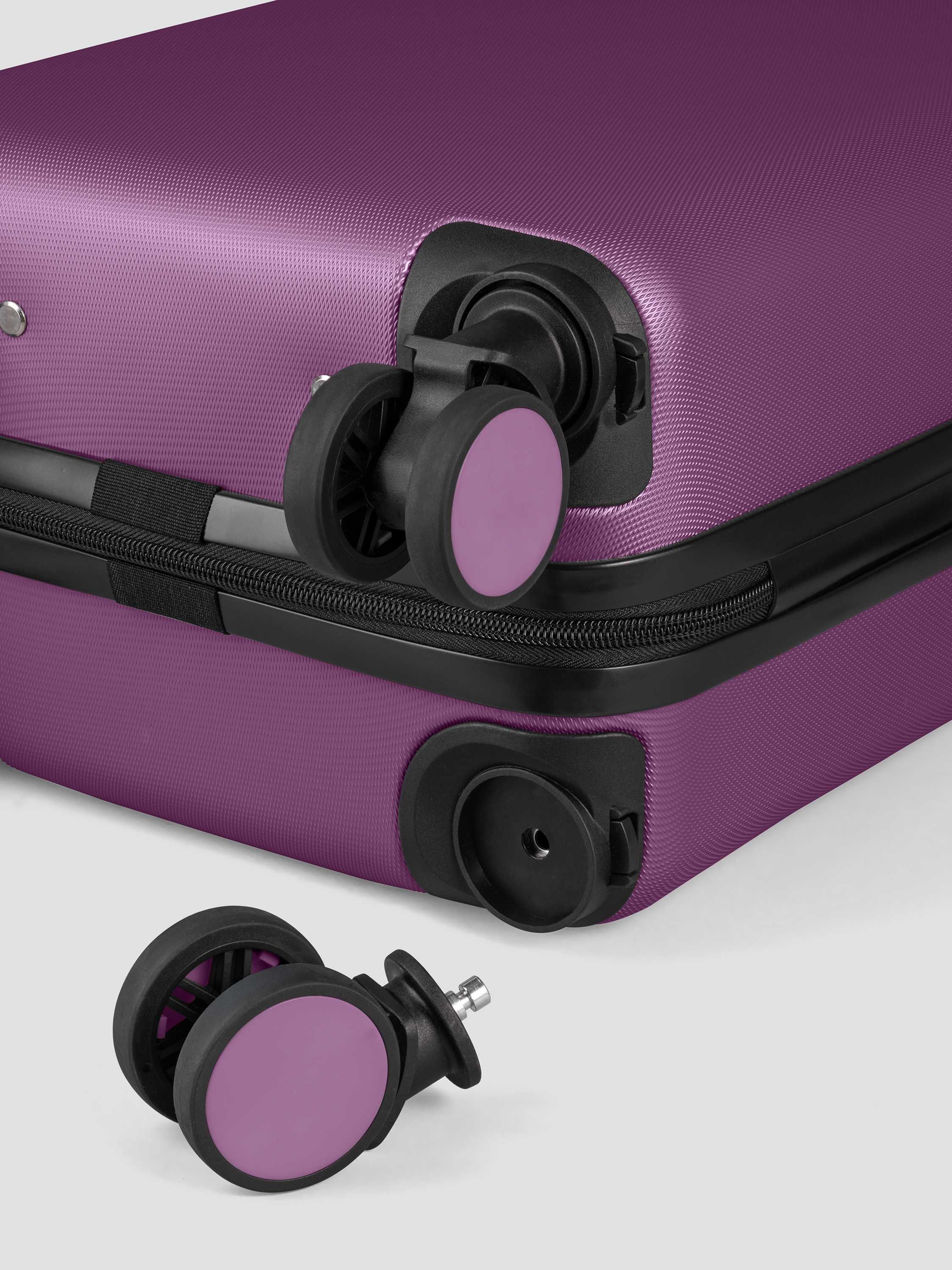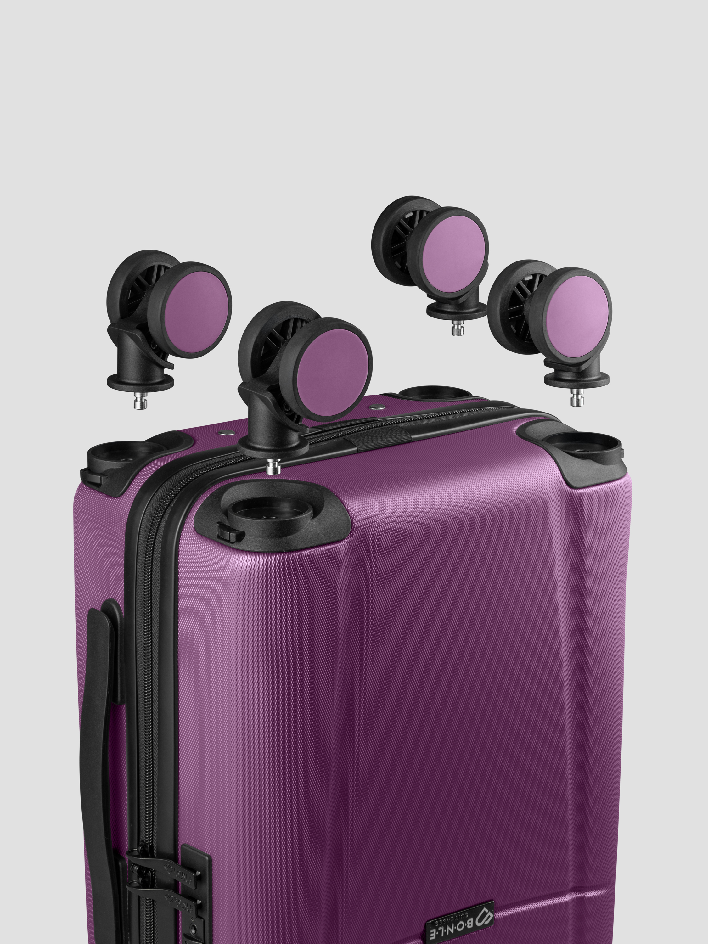 • Прорезиненные съемные колеса вращаются на 360°, обеспечивая высокую маневренность. Чемодан легко катится по любой поверхности.
