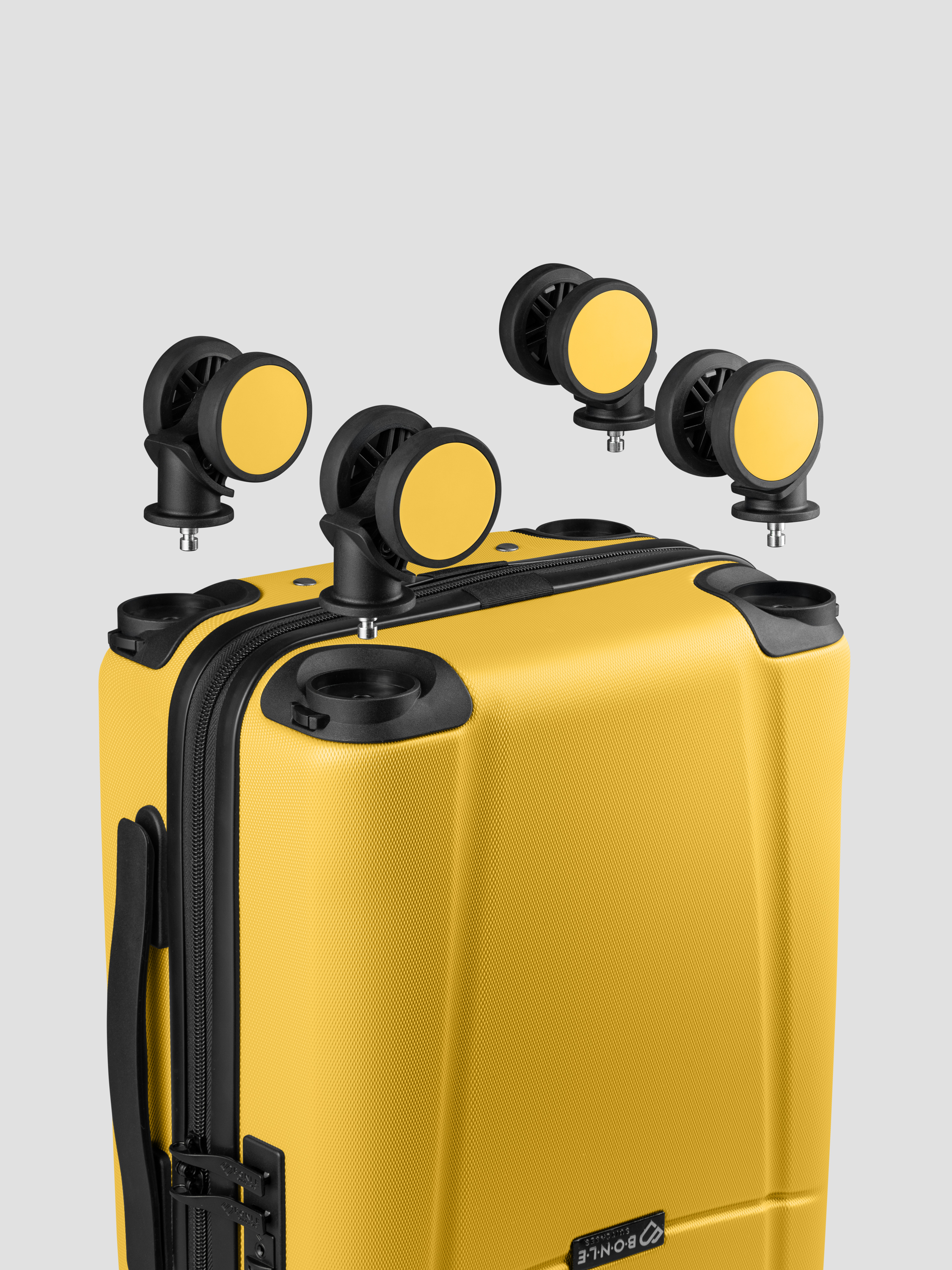 • Прорезиненные съемные колеса вращаются на 360°, обеспечивая высокую маневренность. Чемодан легко катится по любой поверхности.
